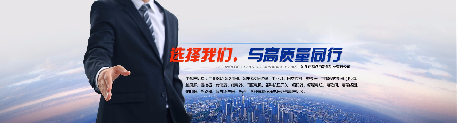 汕頭市福創(chuàng)自動化科技有限公司是一家集自動化元件的代理銷售與維修、自動化設備設計制造、自動化工程安裝改造、機電工程安裝改造、自動化機械設備設計與制造的企業(yè)。 主營產(chǎn)品有:工業(yè)3G/4G路由器、GPRS數(shù)據(jù)終端、工業(yè)以太網(wǎng)交換機、變頻器、可編程控制器(PLC)、觸摸屏、溫控器、傳感器、繼電器、伺服電機、各種按鈕開關、編碼器、編程電纜、電磁閥、電磁線圈、定時器、斷路器、固態(tài)繼電器、光纖、各種模塊低壓電器及氣動產(chǎn)品等。